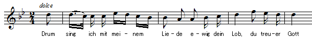 | Drum sing ich mit meinem Liede ewig dein Lob, du treuer Gott! | それゆえ私は歌います、私の歌で永遠に、あなたの称賛を、信実なる神よ! |