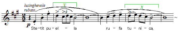 前の曲に答えてSop独唱が歌うくすぐるような旋律は、五度の二段跳躍という印象的な出だしで惹きつけます。"rufa tunica"の部分は、Bar独唱が歌った譜例28のxを持つフレーズとぴたり一致する音程です(一方で露払いをするリズムが第11曲の譜例18部分の伴奏と同じなのは興味深いです)。前曲を受けてのロ調ドリアともいえますが、保続音と始まりがホ(E)で少し明るい感じなので、ホ調ミクソリディアのほうが近いでしょうか。二度隣接は上のFisが重ねられ、和音はさらにHとAを加えています(つまり旋律の最初の3音+A)。旋律のy音形も特徴的です。