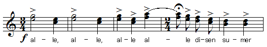 "Swaz"の各節の歌詞は、行番号で 1-1, 2-2, 3, 4* と歌われ、最後にオルフが付加した"Ah, Sla"で締めくくります。*の行では行内の単語が反復(alle, alle, alle, alle disen sumer gan!のように)されます。