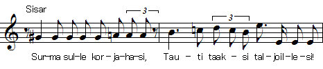 taaksi : taakse(後ろ、あと)maata : maata(座る、横になる)taljoilleni : talja(隠れ場、毛皮)複向次に娘が答える前の2行 Neiti suksilta sanovi,/ hiihtimiltä hiioavi(娘はスキーの上から言った、/滑りながら出し抜いた)は省略されている。以下、こうした語りの前の導入句はみな略して、独唱が直接対話する。
