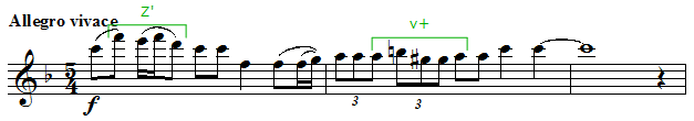 弦とHrのヘ長調和音にトライアングル(Trgl)を加えた明るい響きの上で、5/4拍子[12]の疾走するテーマを第1バイオリン(Vn)が奏でます。装飾音と五度の上下(x+)を特徴とする動機にギャロップのような長短短リズム[13]の下降音形が加わり、この楽章の重要な素材が冒頭で提示されます。ヘ長調で、第4音が半音上がるリディア旋法風です。