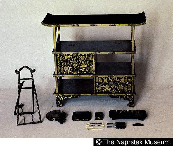 | rdfs:label | "違鷹羽紋橘唐草蒔絵雛道具(厨子棚他)" | ||||